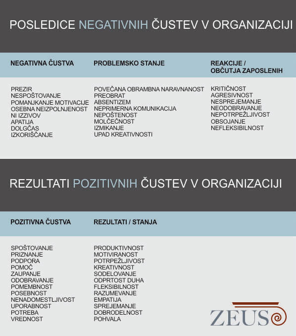 Vsak sodelavec oziroma sodelavka, vsak partner ali stranka, celo poštar, prinesejo v delovno okolje tudi čustva. Ali bodo ta pozitivna ali negativna je odvisno od tega, v kolikšni meri so čustvene potrebe posameznika zadovoljene. Če čustvene potrebe niso zadovoljene, se to izrazi v negativnih čustvih. In ker se s čustvi lahko okolica okuži, imajo dolgotrajna negativna čustva skoraj vedno tudi močan negativni vpliv na sodelavce in organizacijo.